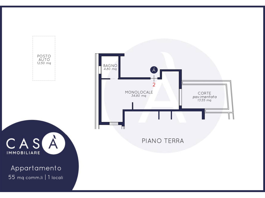 Soluzione al piano terra, con area pavimentata, composta da un ambiente open-space e un bagno.