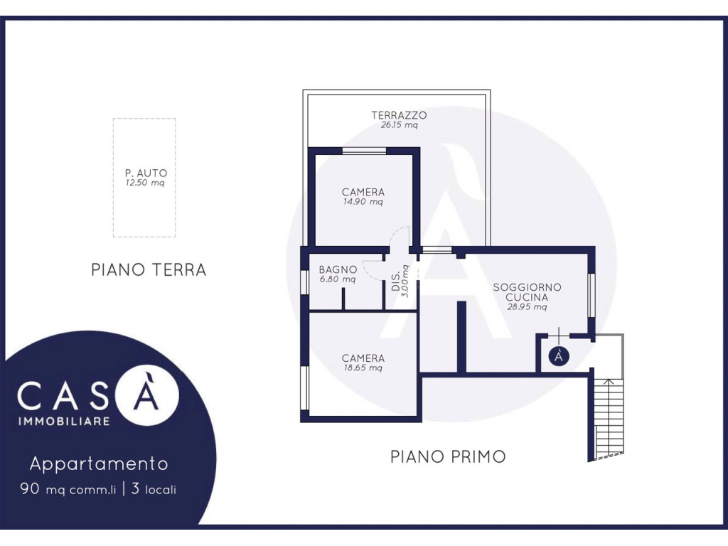Primo Piano: Soggiorno - Cucina in nicchia - 2 Camere da letto matrimoniali - Bagno - Terrazzo