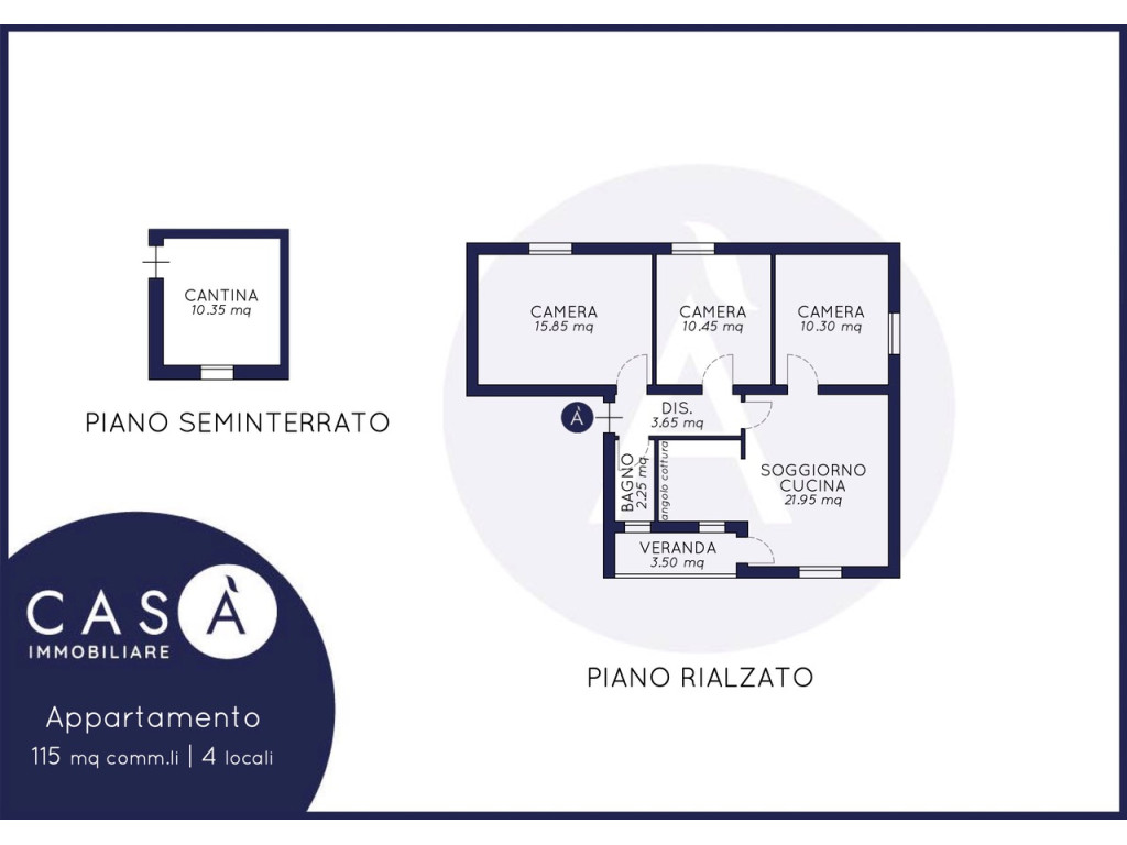 Piano Rialzato: Ingresso - Soggiorno cucina open space - 3 Camere da letto matrimoniali - Bagno - Balcone verandato