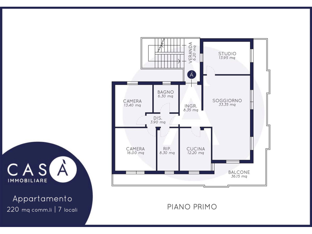 Piano Primo: Ingresso - Soggiorno - Cucina abitabile - 2 Camere matrimoniali - Studio - Ripostiglio - Bagno - Balcone -Veranda