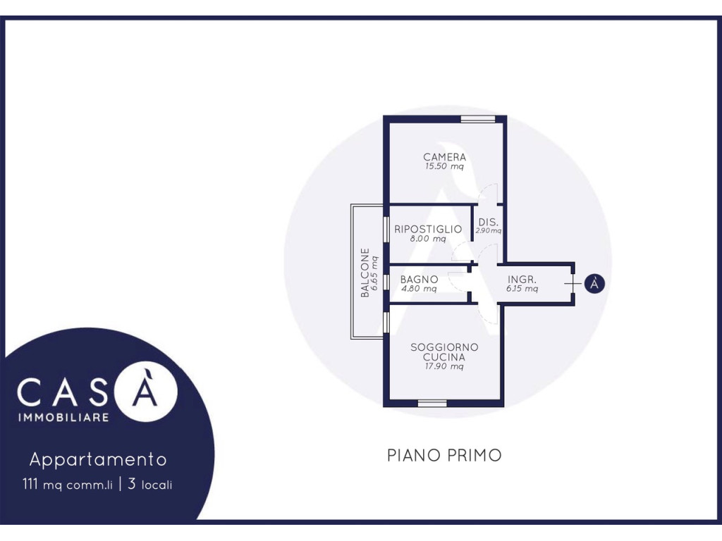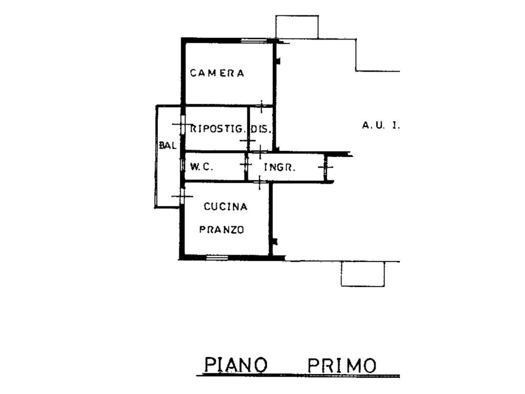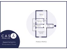 Piano Primo: Soggiorno cucina open space - Camera da letto matrimoniale - Camera a ripostiglio - Bagno - Balcone