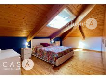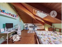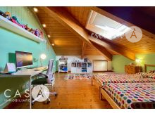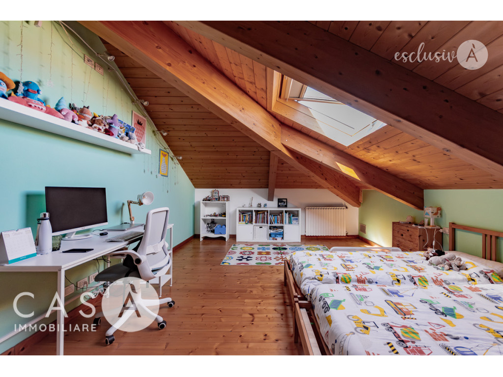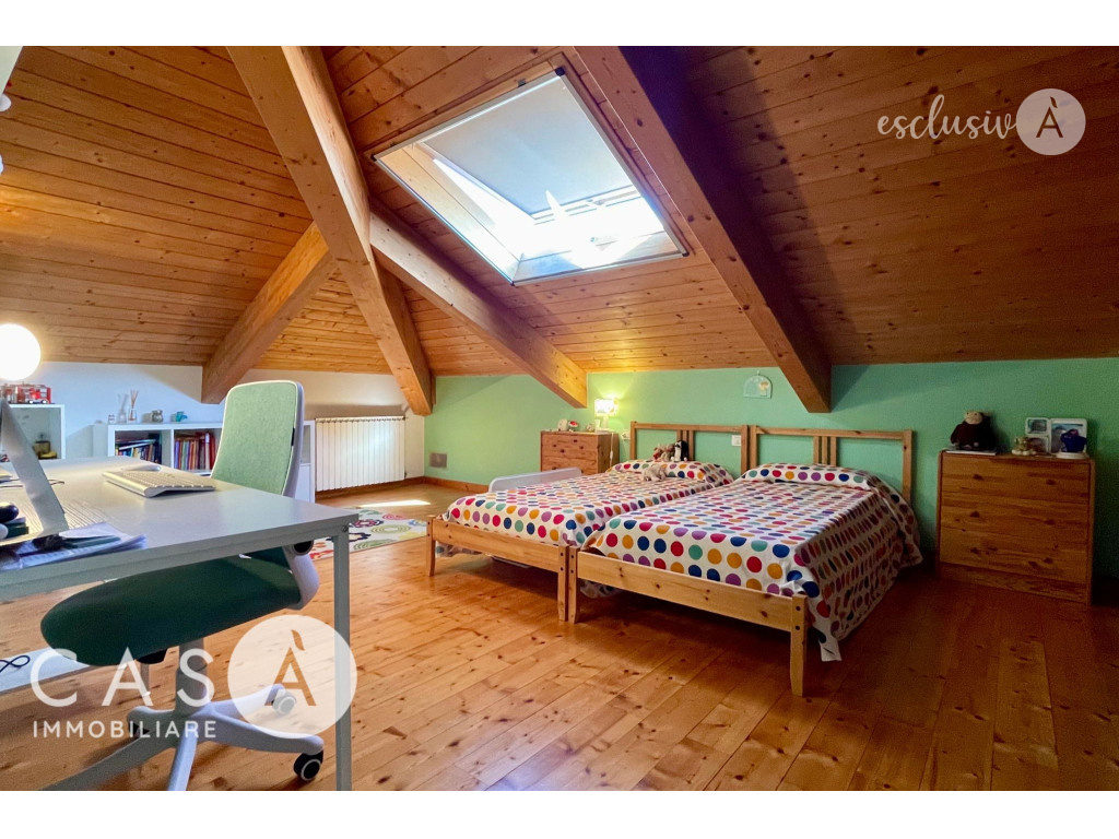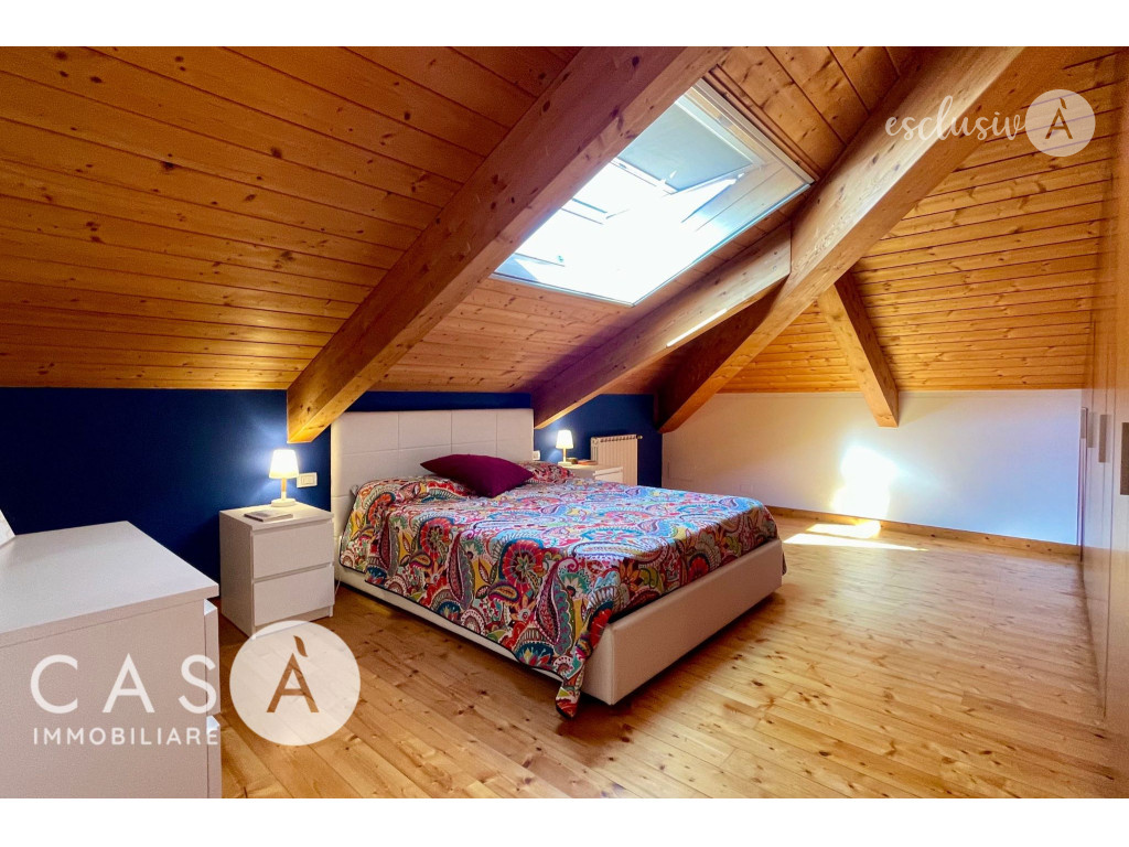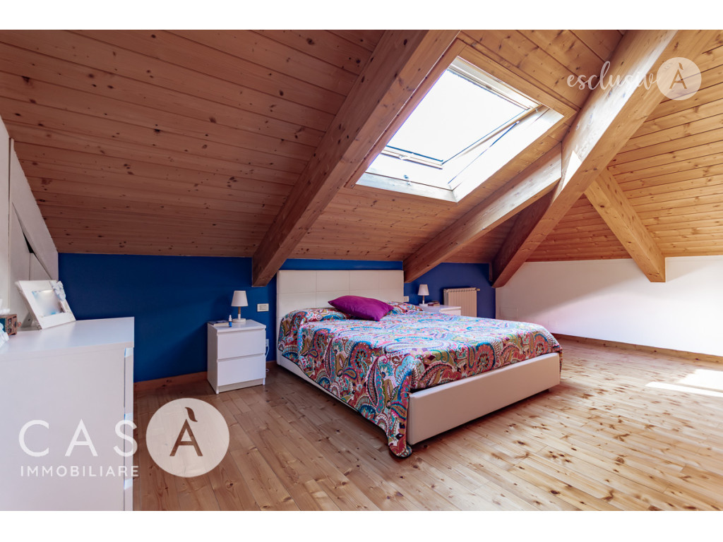 La mansarda abitabile si distingue per le travi in legno a vista e i grandi lucernari, elementi che conferiscono luminosità e un’atmosfera calda e accogliente.