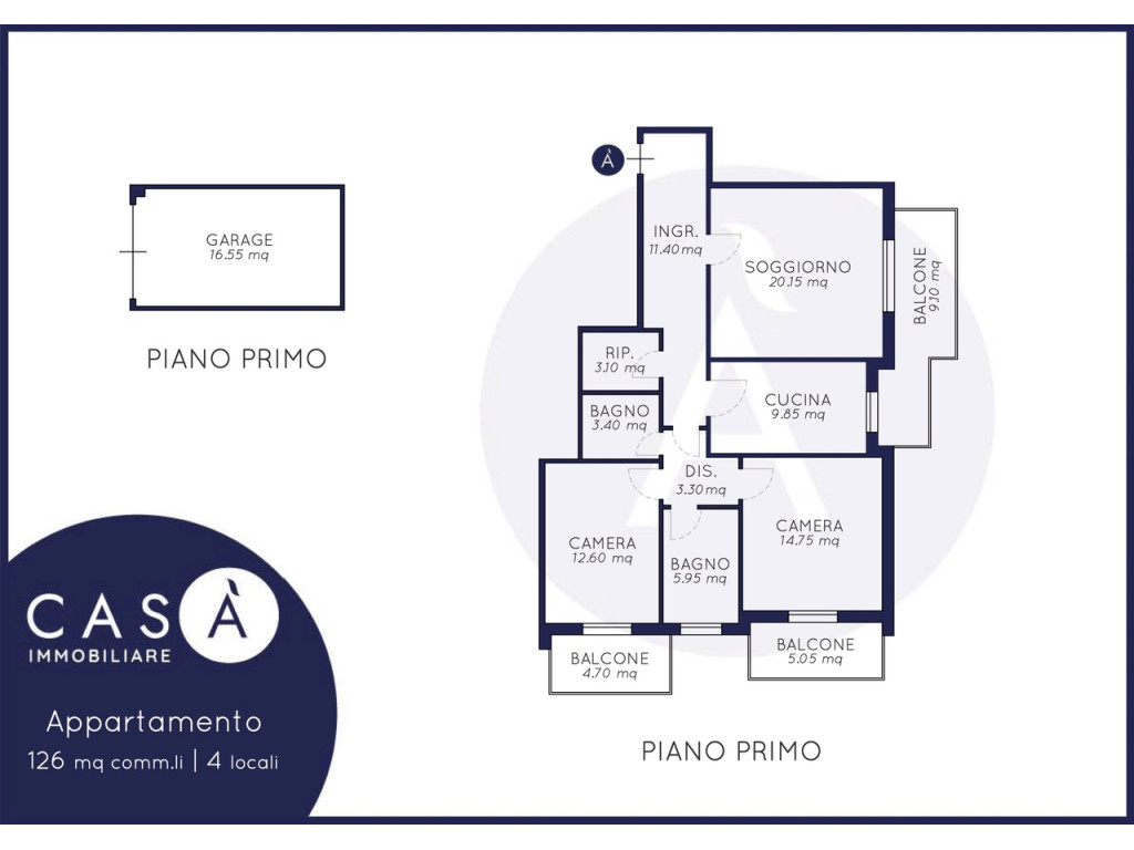 Piano Primo: Soggiorno - Cucina - Camera da letto matrimoniale - Camera da letto doppia - Ripostiglio - 2 Bagni - 3 Balconi