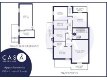 Piano primo: Ingresso - Soggiorno - Cucina - Disimpegno - 2 Camere da letto matrimoniali - Bagno - 1 Camera matrimoniale con Bagno en suite - 3 Balconi. Possibilità di creare un ulteriore camera doppia per totale 4 Camere da letto.